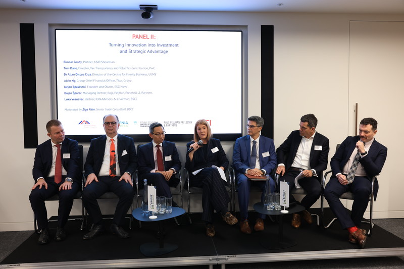This was followed by a second panel discussion on Resilient Growth: Turning Innovation into Investment and Strategic Advantage, which examined how innovative companies can move from early-stage development to investor readiness and long-term value creation. The conversation highlighted the innovation triangle between science, government, and business, and explored how legal, tax, financial, and strategic frameworks shape a company’s ability to scale, attract quality investment, and build competitive strength in global markets. The panel brought together a number of experts: Eimear Coady, Partner of A&O Shearman; Tom Dane, Director, Tax Transparency and Total Tax Contribution at PwC; Dr Allan Discua Cruz, Director of the Centre for Family Business at LUMS; Alvin Ng, Group Chief Financial Officer of Titus Group; Dejan Spasovski, Founder and Owner of ESG Novo; Bojan Šporar, Managing Partner of Rojs, Peljhan, Prelesnik & Partners; Luka Vesnaver, Managing Partner of ION Advisory & Chairman of the Chamber. Both discussions were moderated by Žiga Fišer, Senior Trade Consultant at the Chamber.
